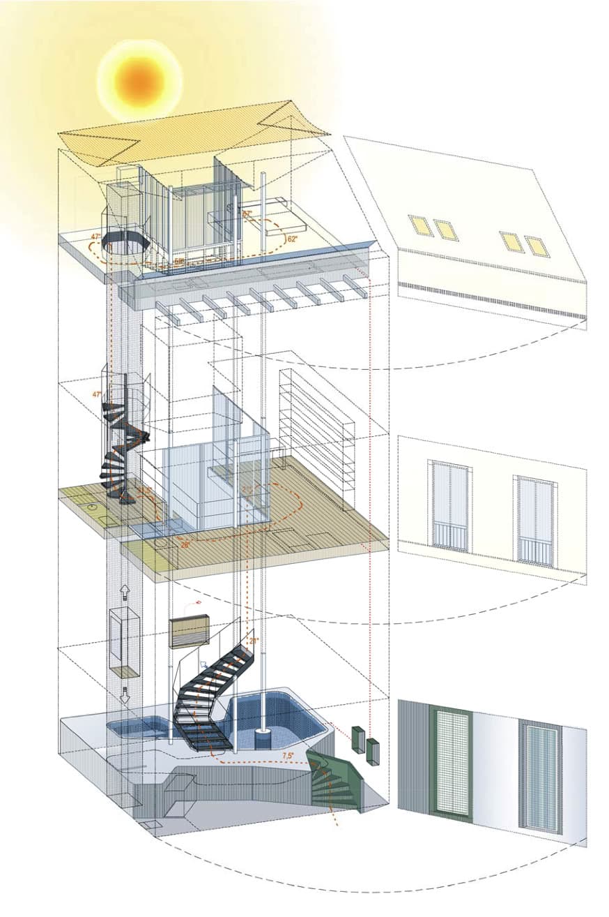 El hueco del espacio central de la casa tiene un lucernario con paños acristalados que se pueden abrir. Este detalle colabora en la ventilación cruzada de la vivienda. Permite crear situaciones curiosas de confort: nadar en la piscina de agua caliente (37ºC) mientras nieva o llueve dentro de la casa!