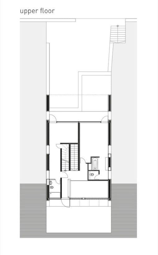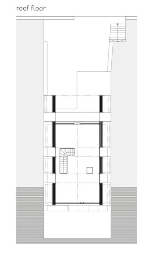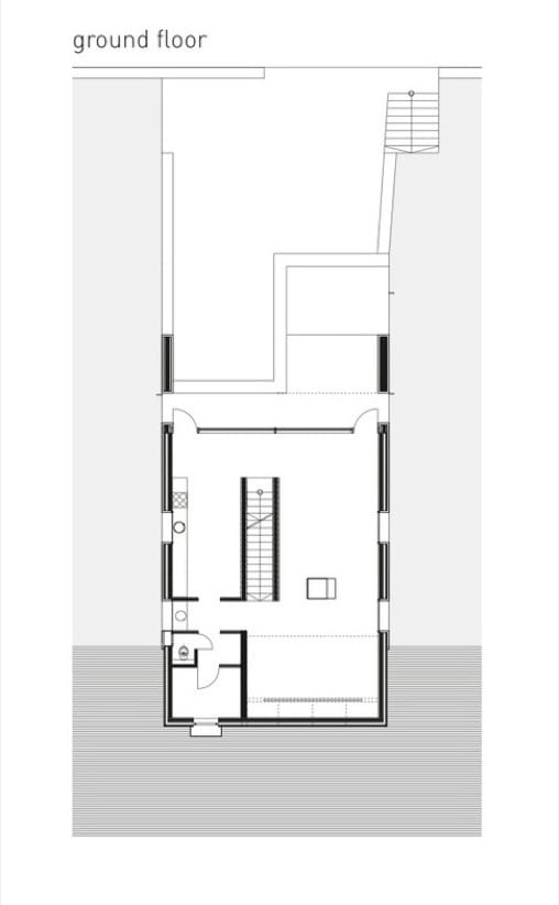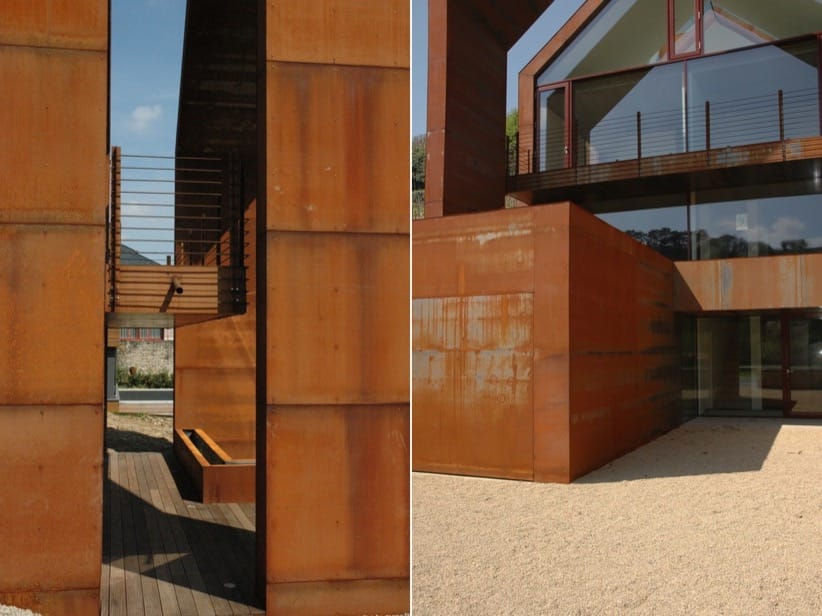 Lo más interesante de este proyecto está en cómo se ha ‘roto’ un volumen tan simple para dar luz al interior. No existen huecos de ventanas como tal, sino un frontal al río muy acristalado y unas franjas de vidrio que van de lado a lado, incluyendo la cubierta. El pórtico delantero ayuda a dar sombra a la fachada principal, y sigue la misma textura del resto de la casa: chapas de acero.
