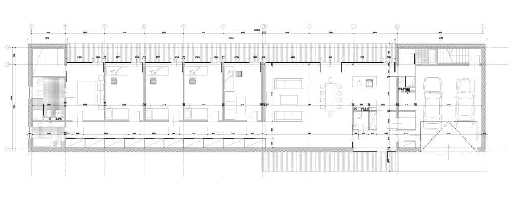 La superficie total de la casa es de 300m2, y tiene su entrada por el lado norte, donde está también la puerta del garaje. Esta fachada tiene un aspecto similar, pero en este caso no hay paneles plegables (la madera es un revestimiento fijo). Además en este lado lo que existe es un corredor de acceso a las cinco habitaciones (4 de ellas dormitorios) con una sorprendente ‘batería’ de armarios empotrados con puertas correderas de policarbonato.