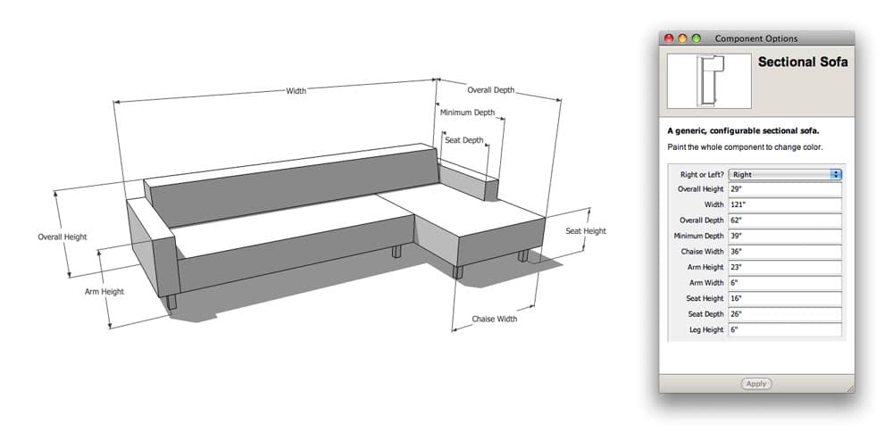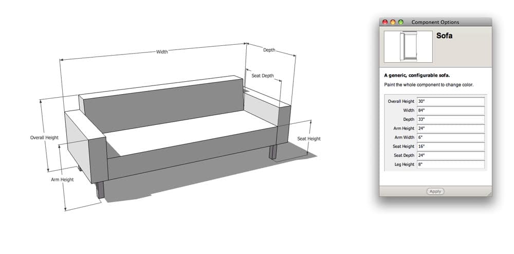 Pero si esa no es tu situación, esto que te voy a contar te vendrá bien para cualquier sofá que desees introducir en tus proyectos, o modelos de decoración. Se trata de un fichero creado como componente dinámico, en el que sus medidas están parametrizadas. Sólo tienes que preocuparte de tener las dimensiones reales del sofá que te interesa, y luego introducirlas en SketchUp.