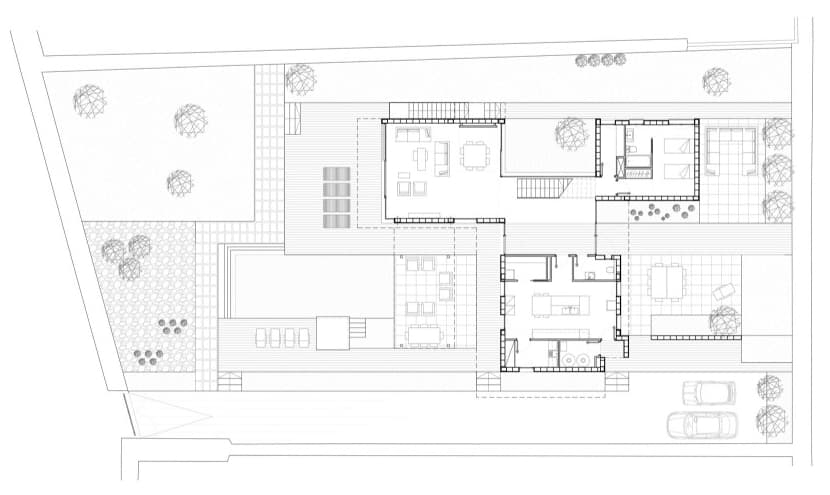 La vivienda está ubicada en una atractiva parcela, casi rectangular, de unos 443m2. La superficie ocupada por el edificio busca en todo momento relación directa con el jardín. Por eso hay una gran variedad de espacios para disfrutar al aire libre. La organización se hace en dos plantas, pero en tres volúmenes conectados, dejando en el núcleo central la escalera. Así, en la planta baja uno de estos cuerpos está ocupado por la sala de estar y comedor; otro por una amplia cocina, lavadero, aseo, despensa, e instalaciones; y el tercer volumen tiene un dormitorio con baño incluido. La planta superior está repleta de dormitorios, hay cinco en total, y cada uno de ellos con cuarto de baño. Encontramos aquí arriba que algunas de estas estancias disponen de amplios balcones que se asoman a la zona de piscina.
