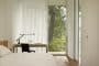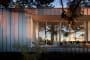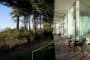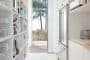 Si observamos el plano de planta (abajo), vemos que la distribución de esta casa de verano es un tanto peculiar. Casi la mitad de su superficie está destinada al dormitorio principal; tiene una entrada a cada lado de la despensa; el vestidor es bastante amplio, y el cuarto de baño está muy bien equipado. Los otros dos dormitorios (para huéspedes) están en el extremo opuesto, cada uno con entrada independiente. A destacar la ducha doble con todo el frontal acristalado, y que puede utilizarse por uno u otro dormitorio. El resto de la superficie se destina a cocina, comedor y sala de estar, todo ello en un único espacio. Fuera hay una terraza, conectada al porche, para poder comer al aire libre.