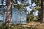 Las fachadas acristaladas tienen carpintería que sigue el ritmo de unas esbeltas columnas de acero. Eso hace que apenas sean visibles desde el interior de la casa. En cambio toda la fachada opaca está revestida de chapa metálica. La cubierta vuela para formar los porches laterales, es plana, y posee vegetación. Este detalle se completa con el filtrado del agua de lluvia, que se almacena en unos depósitos exteriores, próximos a la casa.