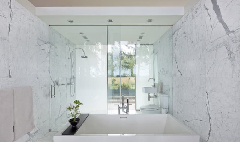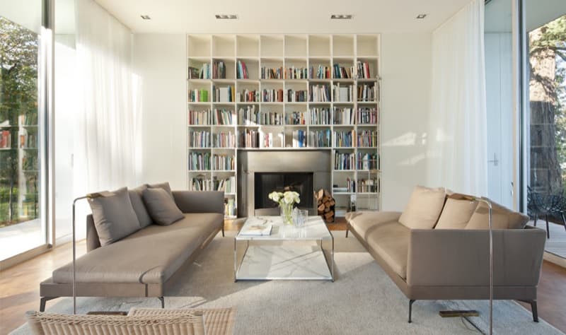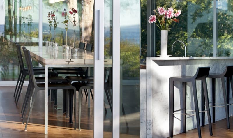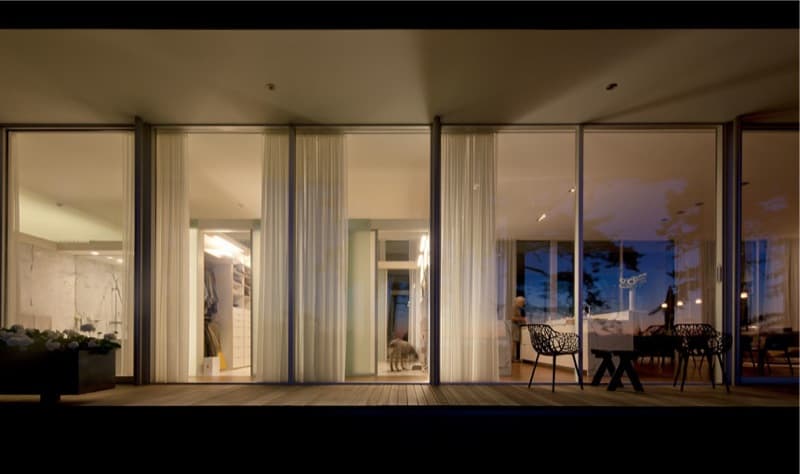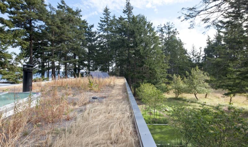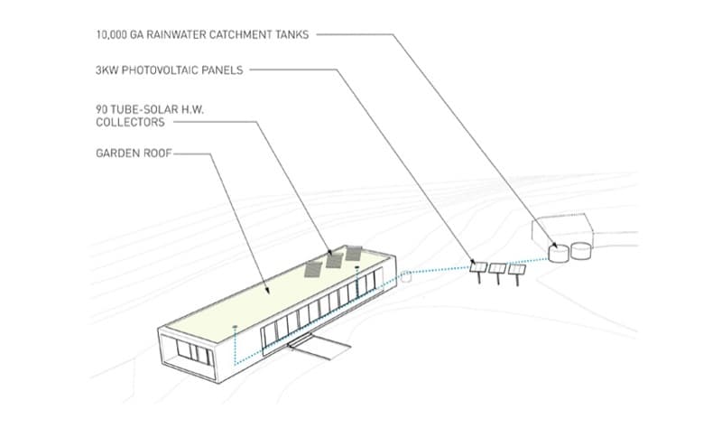 Las fachadas acristaladas tienen carpintería que sigue el ritmo de unas esbeltas columnas de acero. Eso hace que apenas sean visibles desde el interior de la casa. En cambio toda la fachada opaca está revestida de chapa metálica. La cubierta vuela para formar los porches laterales, es plana, y posee vegetación. Este detalle se completa con el filtrado del agua de lluvia, que se almacena en unos depósitos exteriores, próximos a la casa.