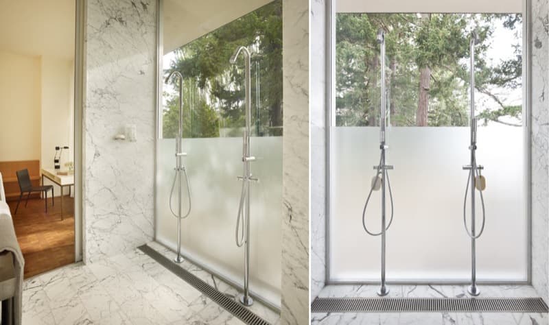 Si observamos el plano de planta (abajo), vemos que la distribución de esta casa de verano es un tanto peculiar. Casi la mitad de su superficie está destinada al dormitorio principal; tiene una entrada a cada lado de la despensa; el vestidor es bastante amplio, y el cuarto de baño está muy bien equipado. Los otros dos dormitorios (para huéspedes) están en el extremo opuesto, cada uno con entrada independiente. A destacar la ducha doble con todo el frontal acristalado, y que puede utilizarse por uno u otro dormitorio. El resto de la superficie se destina a cocina, comedor y sala de estar, todo ello en un único espacio. Fuera hay una terraza, conectada al porche, para poder comer al aire libre.