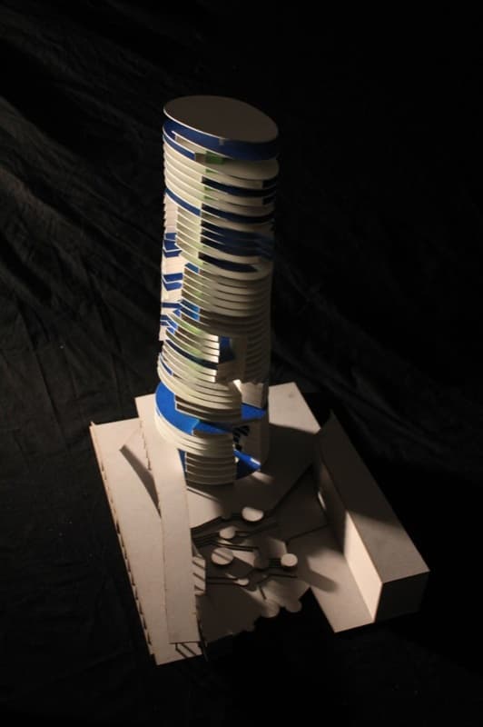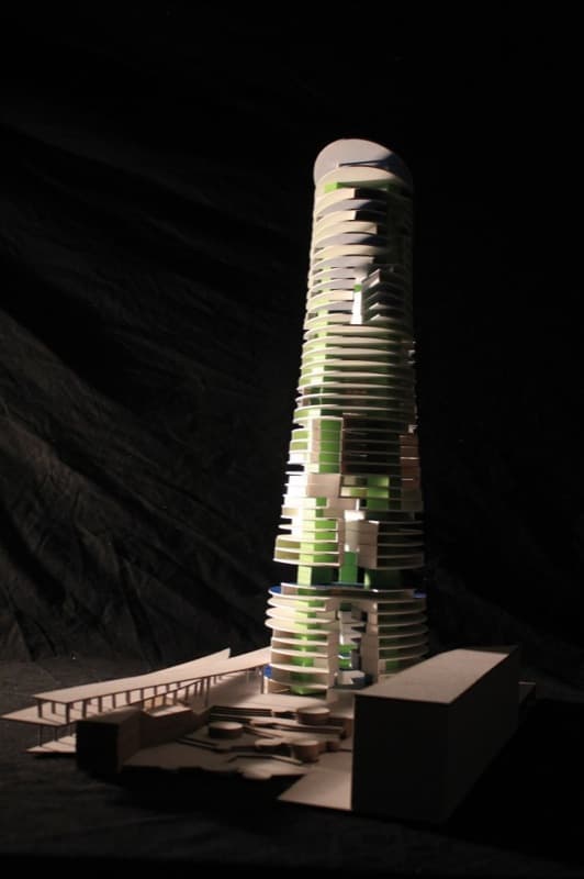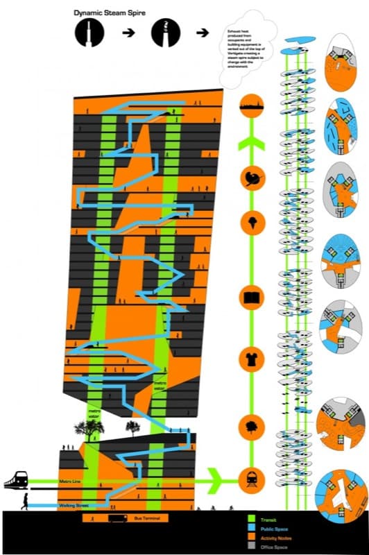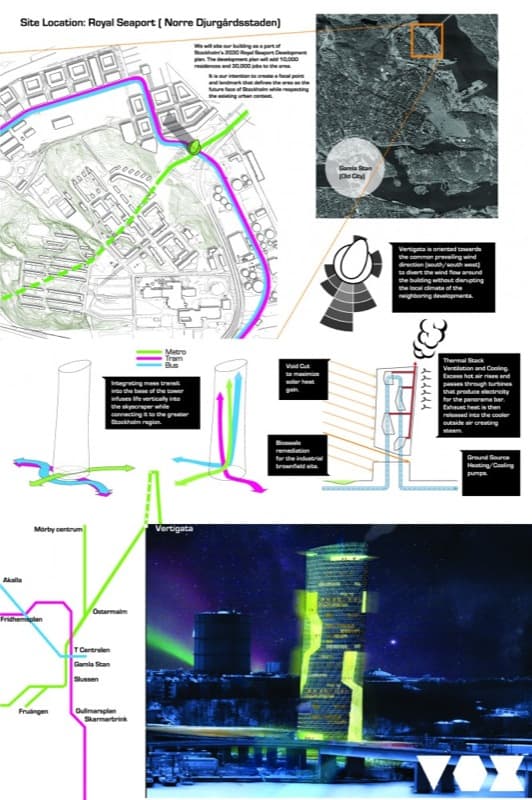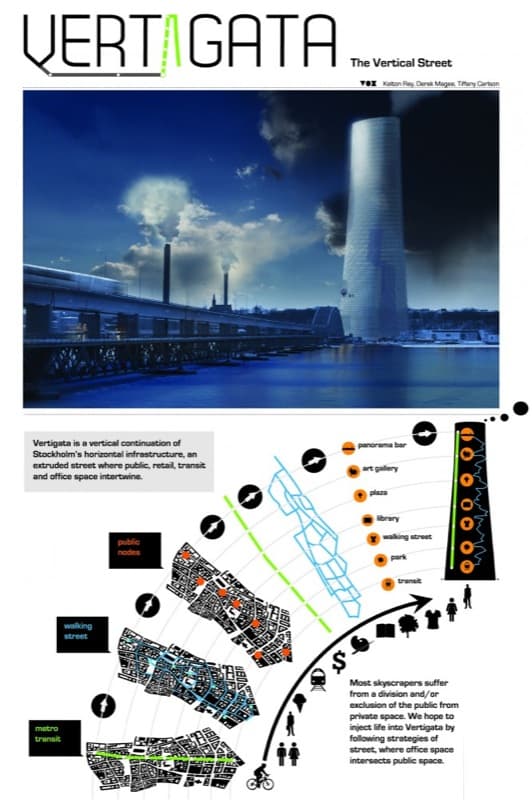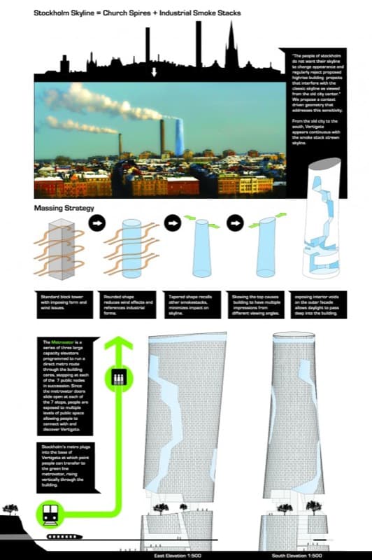 Esta torre está proyectada como una calle vertical, interconectando lo público con lo privado. Se asemeja a las chimeneas que forman desde hace tiempo parte del horizonte de Estocolmo. Las comunicaciones verticales dentro de esta torre son de dos tipos. Hay un ‘metrovator‘, que hace escala en cada uno de los nodos públicos; y una calle peatonal ascendente, donde los ciudadanos puedan ir de compras y disfrutar de diferentes puntos de interés a lo largo de su recorrido. Es un concepto interesante, pero no muy original, pues nos recuerda mucho al cubo de BIG en Taipei.