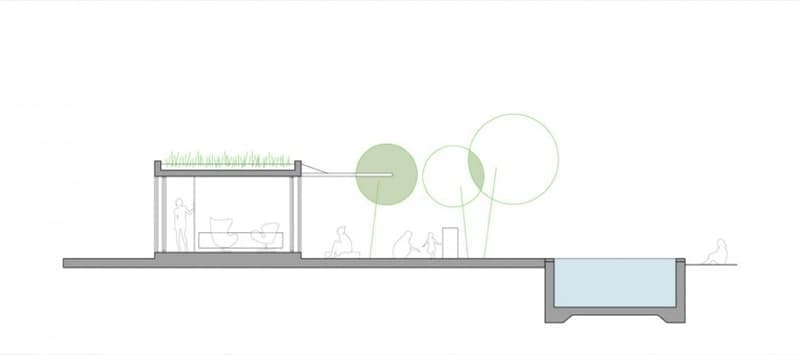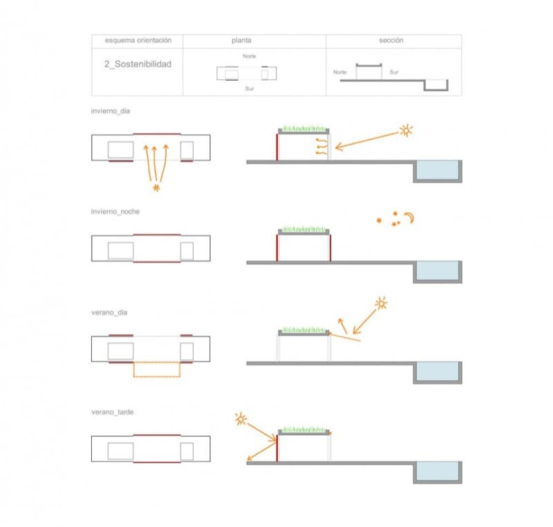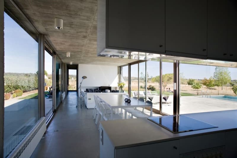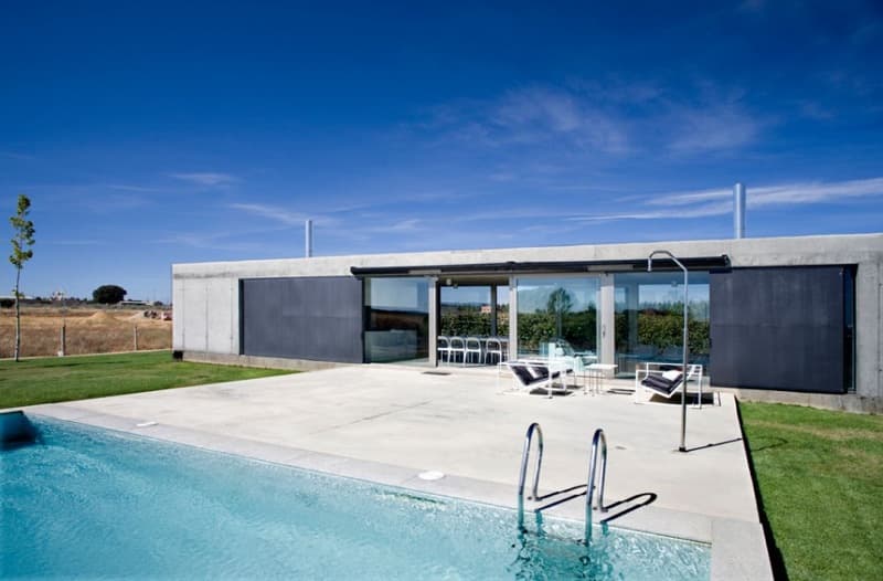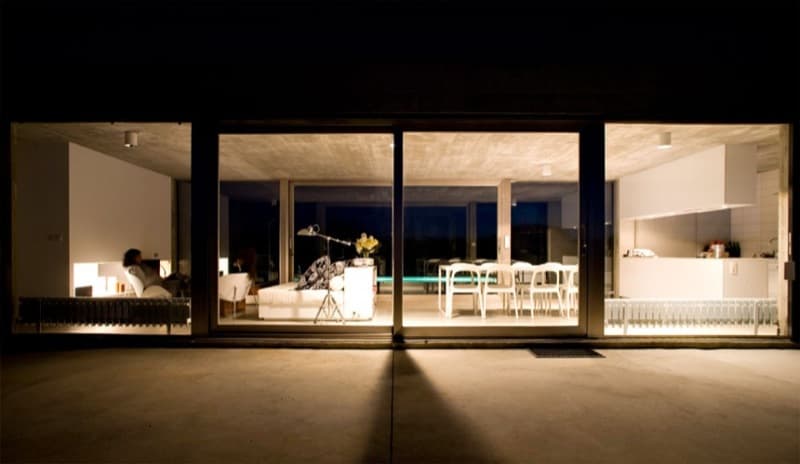 La estructura de la casa es de hormigón armado, con una cubierta plana vegetal apoyada en los muros perimetrales. En las fachadas norte y sur hay un gran hueco rectangular, de 9 x 2,5 metros . Esta característica hace que el salón de la vivienda esté muy vinculado con el exterior, sobre todo en época estival. Estos grandes huecos poseen unas puertas correderas acristaladas, y paneles metálicos deslizantes exteriores.