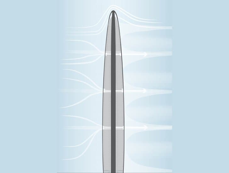 En sus 119 plantas (con forma de trípode) se distribuirán 200.000m2 de oficinas. Pero también cuenta con apartamentos de lujo, un hotel de cinco estrellas, club privado,… Una característica muy peculiar de su fachada serán las aberturas distribuidas por su superficie. Están ahí para reducir la carga de viento sobre la estructura del rascacielos. El sistema de ventilación del edificio será capaz de pre-calentar o pre-enfriar el aire acondicionado (entalpía pura y dura). También contará con un sistema de recuperación de las aguas grises de ciertas instalaciones. Esas aguas son recicladas para un sistema de enfriamiento por evaporación. La grifería y sanitarios instalados ayudarán a un bajo consumo de agua.