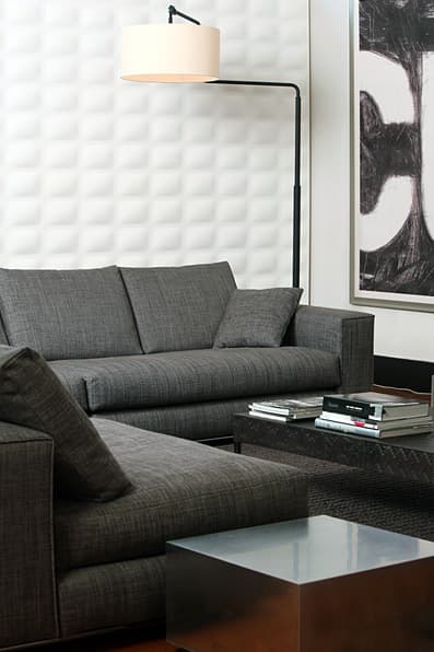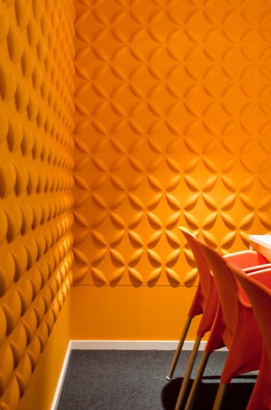 Este tipo de panel es de los que añade un efecto 3D (relieve) a su patrón. Está disponible en seis modelos diferentes, pero la lista sigue aumentando poco a poco. Los módulos tienen un tamaño de 46 x 46 cm (espesor=2cm), que como se ve, se trata más bien de grandes «azulejos». El color original es el blanco, son retardantes al fuego, y repelentes al agua. Se fijan a las paredes con adhesivo acrílico, como si se tratara de papel pintado pesado.