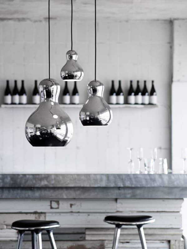 Estos diseños están fabricados en aluminio estirado, y tienen un acabado en cromo lacado que refleja todo el entorno, como un espejo. La lámpara puede ser negra, dorada, plateada, o en color rojo. Todas ellas tienen un reflector en la cara inferior que aumenta la luz hacia abajo, y un cable negro forrado de tela que hace un buen contraste con el resto de la lámpara. Pueden ser en tres formatos diferentes: P1, P2 y P3,  de diámetros 158, 224, y 340mm respectivamente. Con este modelo se pueden crear unas combinaciones estupendas, ya sea para el hogar, o cualquier establecimiento comercial.