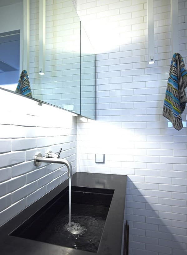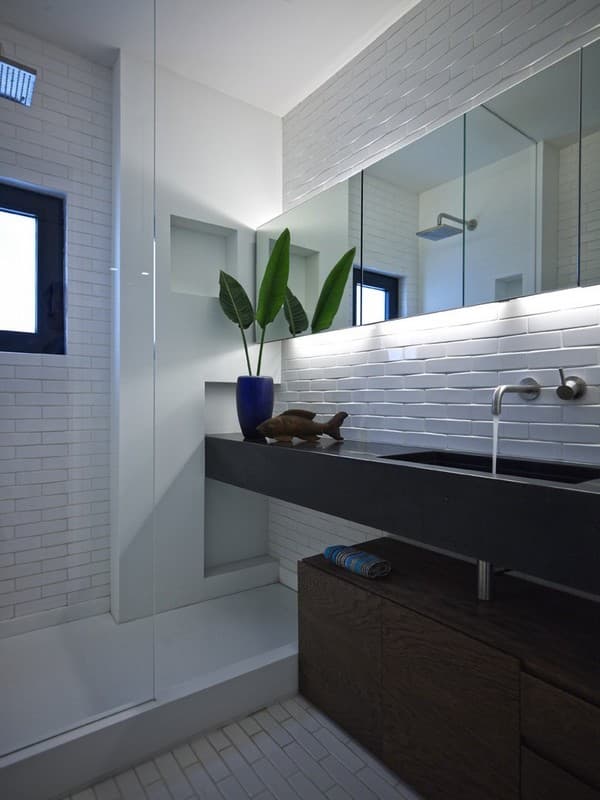 - La encimera del cuarto de baño lleva incorporado el lavabo, y se extiende hasta la pared de la ducha.