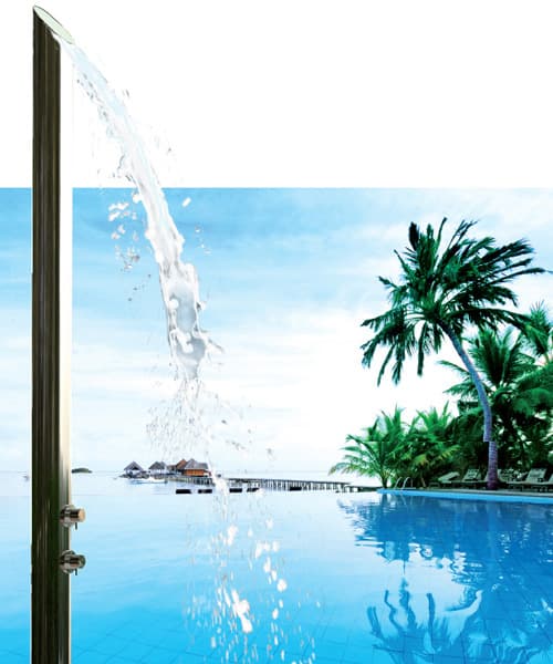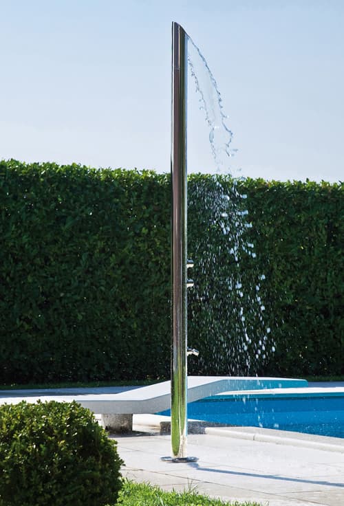 Este elemento puede estar instalado junto a una piscina, o en cualquier zona del jardín. La columna AquaBambù es una columna de ducha fabricada en acero inoxidable, preparada para anclarla al suelo. Tiene entrada para agua externa, tanto de agua fría como caliente. El cuerpo es un esbelto cilindro rematado por un corte oblicuo; este detalle en su diseño se ha aprovechado para colocar la salida del agua en forma de una original cascada. Además cuenta con un difusor de aerosol para los pies. Puede tener un acabado en brillo o en mate.