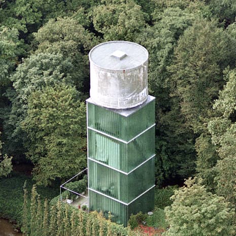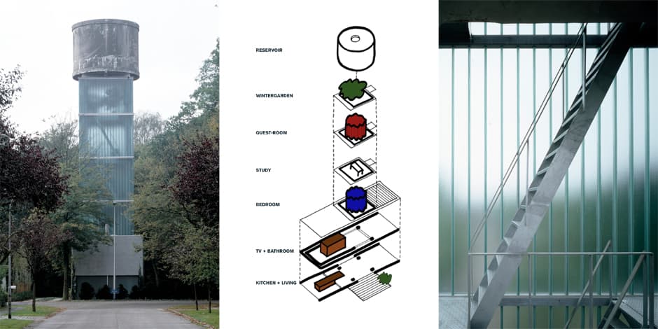 Esta estructura de torre para depósito de agua se aprovechó para alojar en ella una vivienda. Así de contundente fue la idea que tuvo en su día el propietario. Quería una moderna y sencilla casa de bajo presupuesto, y obtuvo la que se le conoce como Woning Moereels (Amberes, Bélgica).