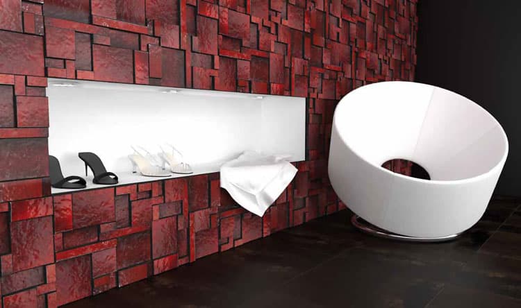 Estos azulejos con relieve crean una superficie con diferentes volúmenes, todos ellos muy arquitectónicos. Se trata de un material porcelánico con un acabado esmaltado, que es apto tanto para ambientes interiores como exteriores. Los azulejos Habitat están disponibles en color blanco, beige, y rojo, este último nos ha cautivado por completo.