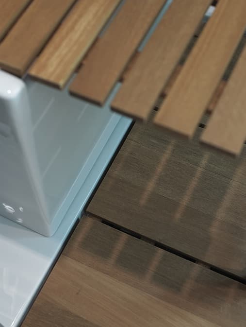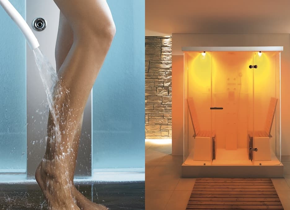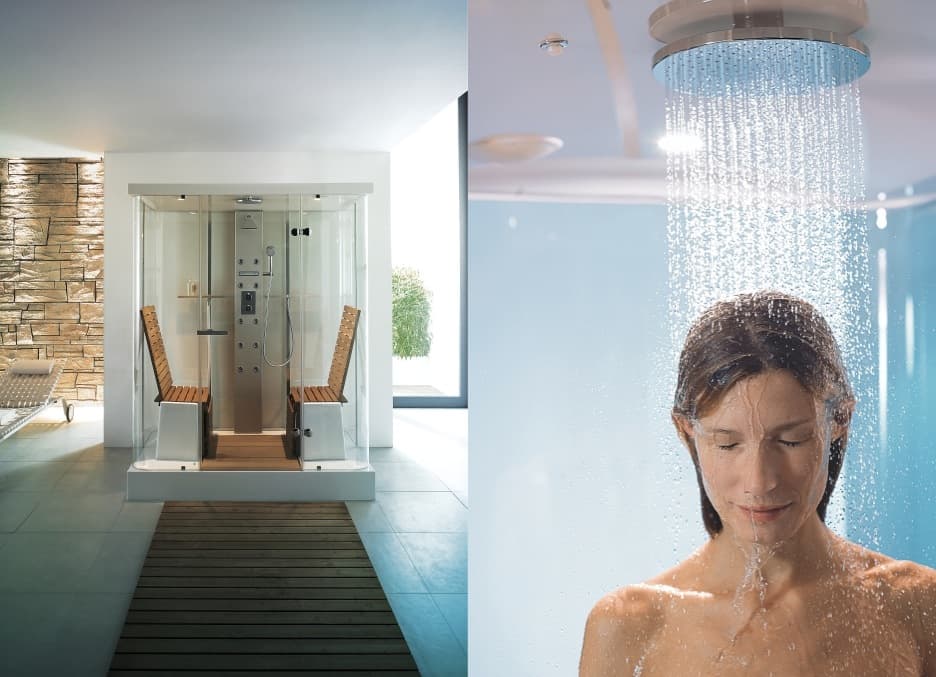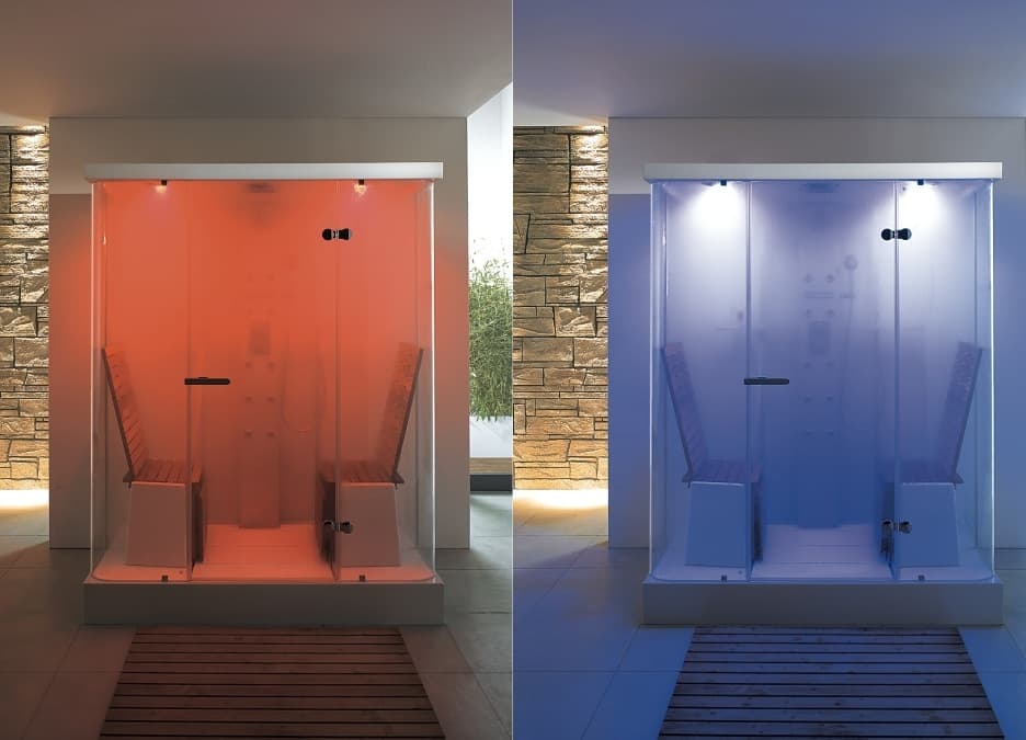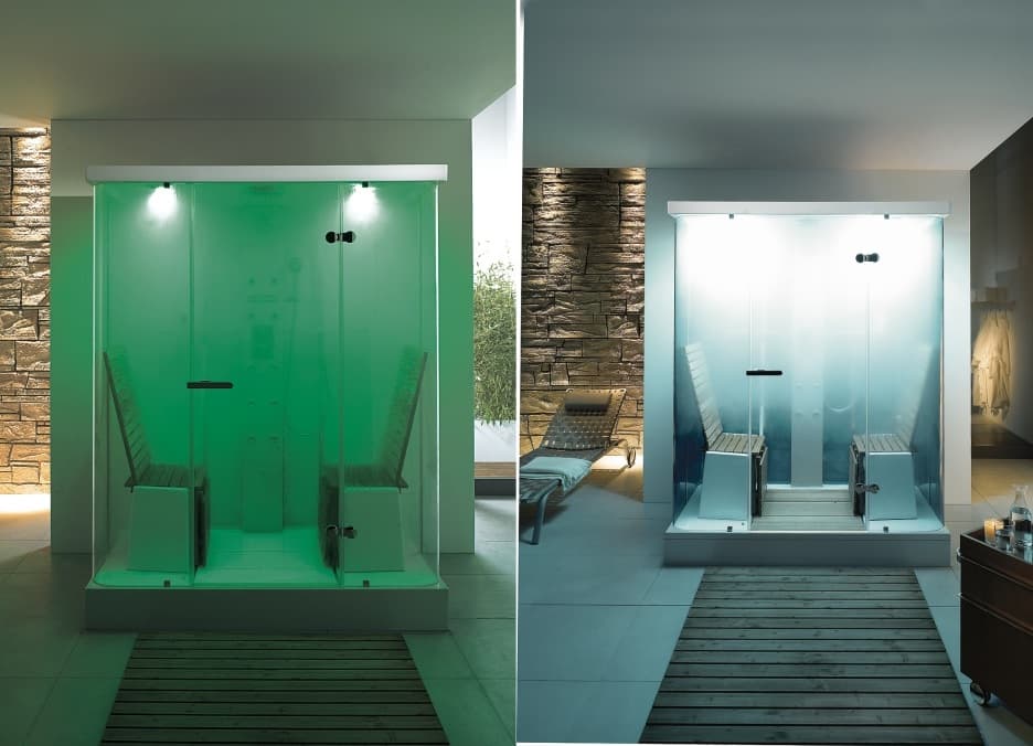 Esta ducha es mucho más que una gran cabina para dos personas. Es un rincón donde relajarse y tomar una auténtica sesión de hidromasaje, un pequeño paraíso spa. Tanto si se quiere o no compartir, esta cabina de ducha tiene espacio suficiente para desenvolverse con comodidad. Y la ventaja añadida de que sus dos asientos de madera se pueden convertir en una tumbona.