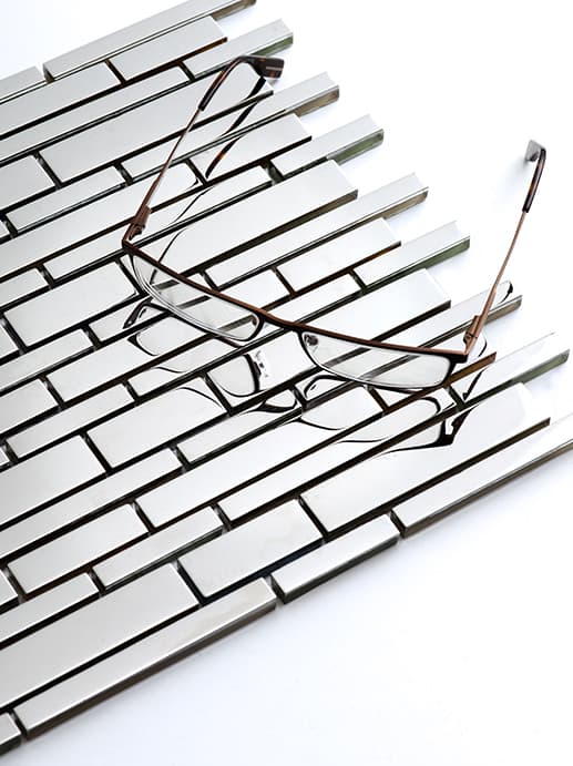 Los azulejos metálicos Viscaya Platino ofrecen una decoración de lujo, que además resulta muy singular. Son adecuados para el revestimiento de paredes en locales comerciales, boutiques, restaurantes, etc. Este sofisticado material puede aportar un relieve muy atractivo también a determinadas viviendas. Su superficie pulida y reflectante se puede conseguir en formatos personalizables, y hechos a medida. A diferencia de los azulejos de vidrio templado, estos azulejos metálicos se pueden cortar. Son resistentes a arañazos y fáciles de limpiar (con windex). Nos encanta el patrón Mirror 3D -por su relieve-, y los de ladrillos Mirror KMS.