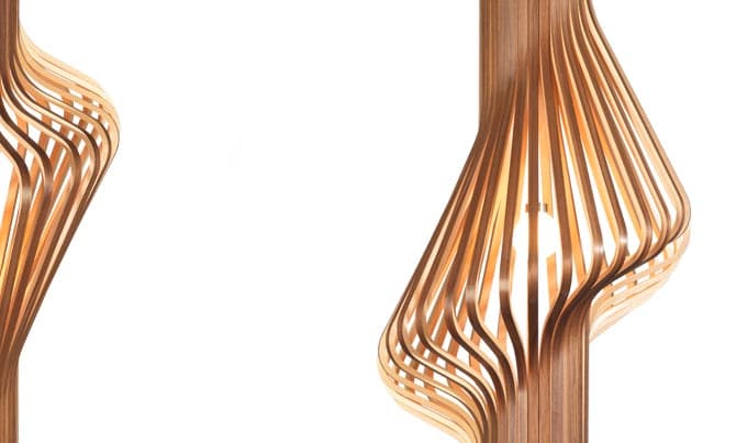 La lámpara DIVA es una delicada escultura, tanto en su versión como lámpara de suelo, o como lámpara colgante. Es un producto hecho a mano que recoge la herencia artesanal noruega en la madera laminada. Pero más interesante aún es que se obtiene un diseño moderno. La pantalla de la lámpara se fabrica a partir de una variación de curvatura. Para ello se utilizan 32 láminas de madera contrachapada, de roble o nogal. En los extremos, la pantalla sigue el recorrido de dos cilindros de madera. Internamente su estructura es de metal, y tiene un pequeño globo de cristal soplado esmerilado.