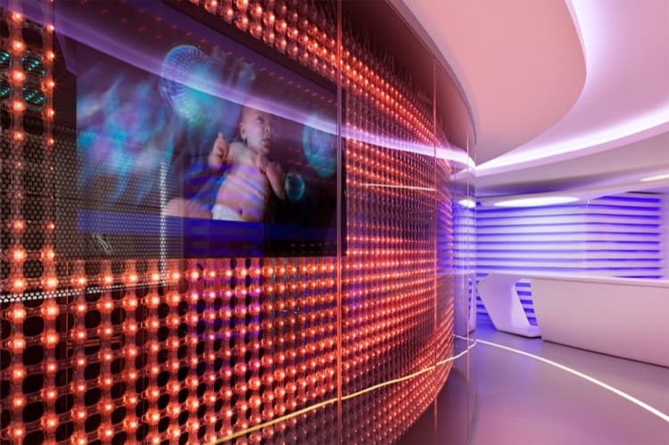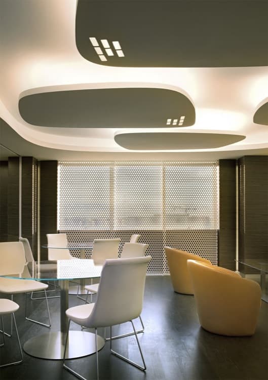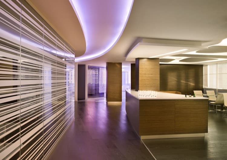 En las fotos vemos diferentes líneas sinuosas de iluminación, tanto en el suelo como en el techo. Se han utilizado varios formatos de mallas de puntos LED, que pueden variar de color. En algunas ocasiones estas mallas aparecen intercaladas con paneles de vídeo. Muchas de las paredes divisorias de estas oficinas están hechas con paneles de vidrio. En ellas se controla el grado de visibilidad con diferentes elementos (vinilos, celosías, o iluminación leds). Cualquier revestimiento y mobiliario está controlado para que el conjunto no pierda en ningún punto su esencia. Esta decoración de interiores es toda una inspiración!