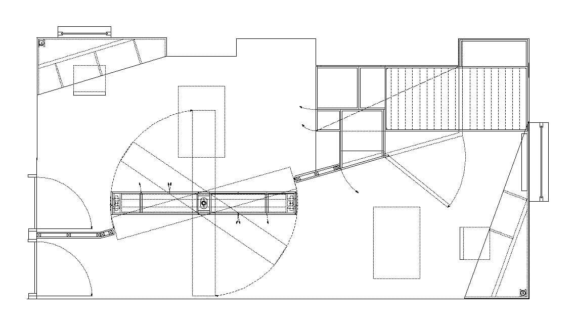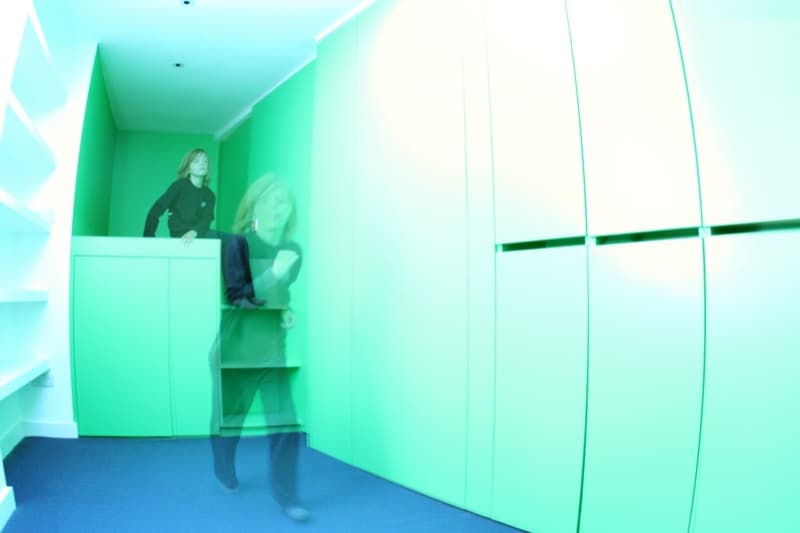 Viendo el vídeo uno se puede distraer bastante con esa pared/armario que gira. En realidad no es más que un elemento móvil de una solución más compleja y astuta, que aprovecha bastante el espacio. La adaptación a esta geometría llegó mediante una diagonal que divide los dos dormitorios. En rincones opuestos se plantean los escritorios; los armarios se sitúan en la parte móvil de la pared divisoria; y en el rincón que queda están las camas, cada una a un nivel, formando parte del mobiliario (diseñado expresamente para este proyecto). Por supuesto, cada habitación mantiene una entrada diferente desde el hueco de escalera de la casa.