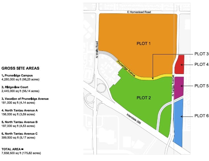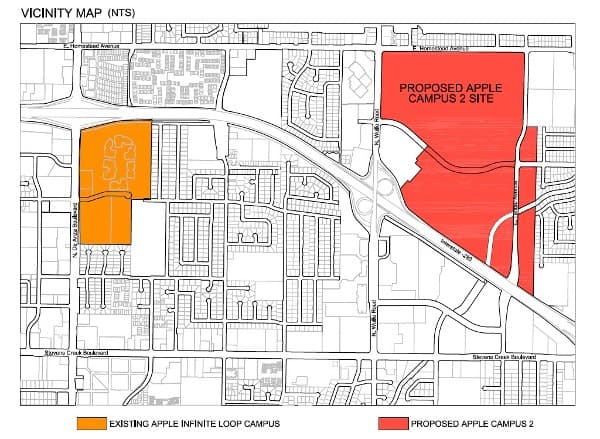El nuevo campus de la compañía tiene una situación estratégica junto a la autopista Interestatal 280 que pasa bordeando el norte de Cupertino. Se extiende a lo largo de 6 parcelas, con una superficie total de 71,2 hectáreas. La más grande de todas (‘Plot 1‘) es la que Apple compró a HP. Es destacable el minucioso inventario de árboles realizado, ya que el proyecto tan solo conservará los de la periferia. El resto serán nuevos, pasando de 4.273 que tiene en la actualidad, a 6.000 árboles plantados. La zona norte del campus es la más ancha, por eso fue elegida para la construcción del edificio principal. El resto va ocupando lugares estratégicos, preferiblemente adosados a las vías rodadas. El Apple Campus 2 está compuesto por los siguientes edificios: