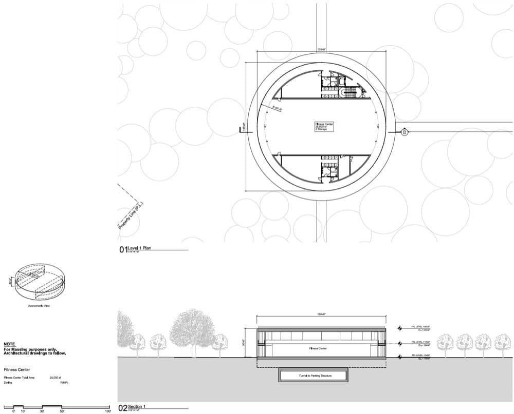 No podía faltar en el campus de una gran empresa como Apple un espacio destinado a mantener en forma a sus empleados. Por eso hay un edificio exento, destinado al fitness, con una superficie de 2.323m2, repartidos en dos plantas. El aspecto exterior va a ser el mismo que el del Auditorio (de planta circular), pero no está conectado por los sótanos al edificio principal. A él se accede a pie o en bicicleta.
