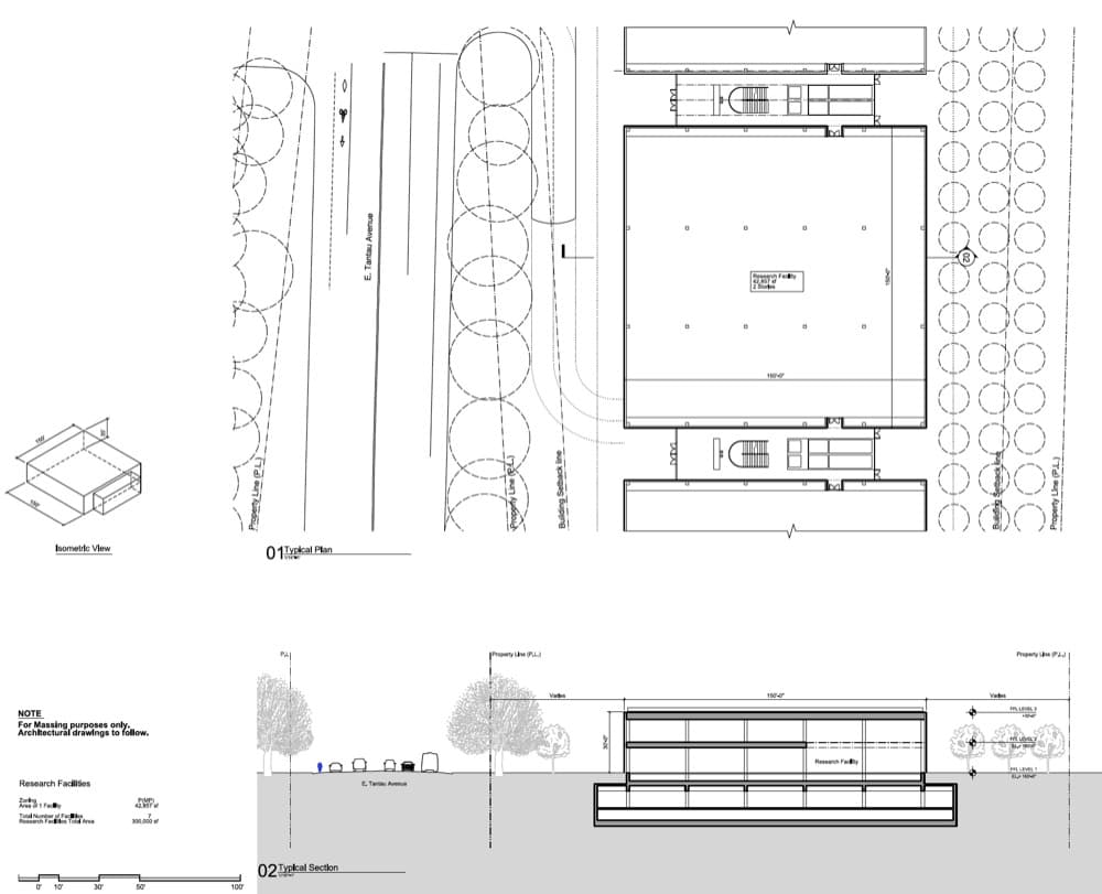 El fácil hacerse una idea del uso que Apple le dará a la instalaciones de investigación. Son las que ocupan las parcelas 5 y 6 del Campus. Esta sección se reparte en 7 edificios idénticos, de forma bastante cúbica, de tres plantas cada uno (una de ellas en sótano). Se nota que Apple se toma muy en serio estas funciones porque tendrán una extensión de 27.870m2.