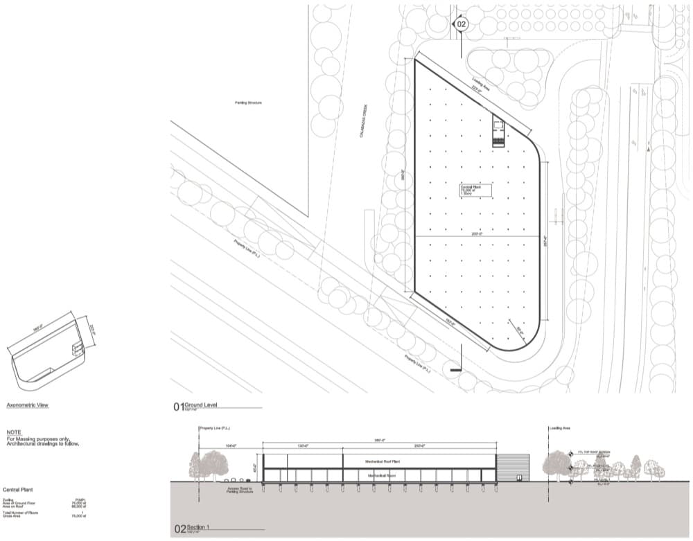 Es el edificio que queda junto al parking, ocupando la esquina del Campus. Está destinado a alojar la maquinaria que supuestamente hará del Apple Campus 2 un complejo autosuficiente de energía. Al parecer (sobre esto no hay mucha información) se realizará empleando gas, porque la azotea fotovoltaica del edificio anterior cubre solo parte de las necesidades energéticas del complejo. Hay que tener en cuenta que el Campus está conectado a la red municipal para posibles emergencias. En total, abarca una superficie de casi 7.000m2, estando su azotea también ocupada por equipamiento, como bien se puede observar en su sección.