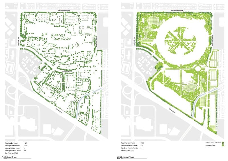 Mirando los planos de sección y sumando medidas, se obtiene que el diámetro exterior del anillo es de 464 metros, y el interior de 354m. Así que, más que un patio, lo que queda en el centro es un parque de 98.423m2, sin ninguna construcción, solamente la masa arbórea entre unos caminos con direcciones radiales.