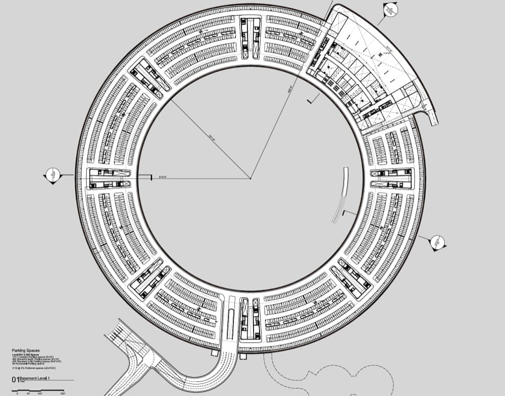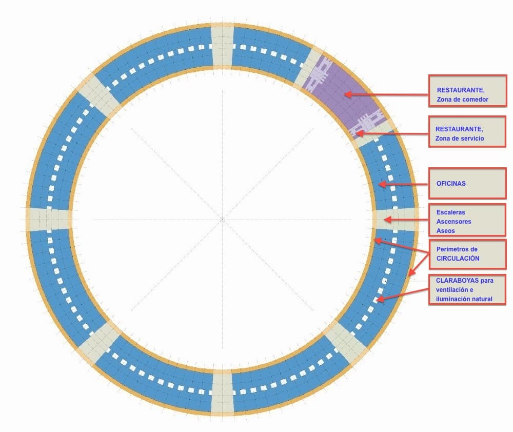 Como ya sabíamos, este anillo tiene 4 plantas, pero aparecen otras 2 bajo rasante que están destinadas al aparcamiento de 4.600 vehículos. La estructura tiene repartido cada 45º un núcleo de escaleras, ascensores y servicios, esquema que no se altera en su altura, tan solo se modifica en uno de ellos para situar ahí el restaurante. Este sector continúa también en los niveles del sótano para alojar las cocinas, cámaras, almacenes… y un muelle de descarga de mercancías.