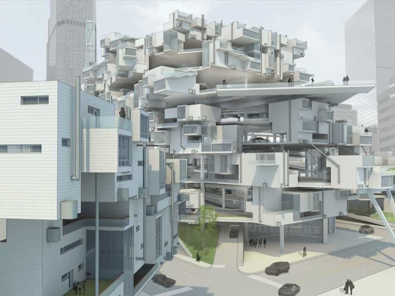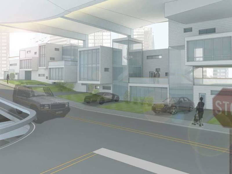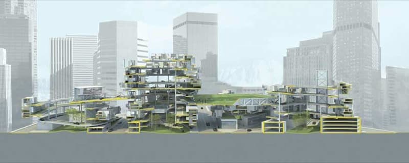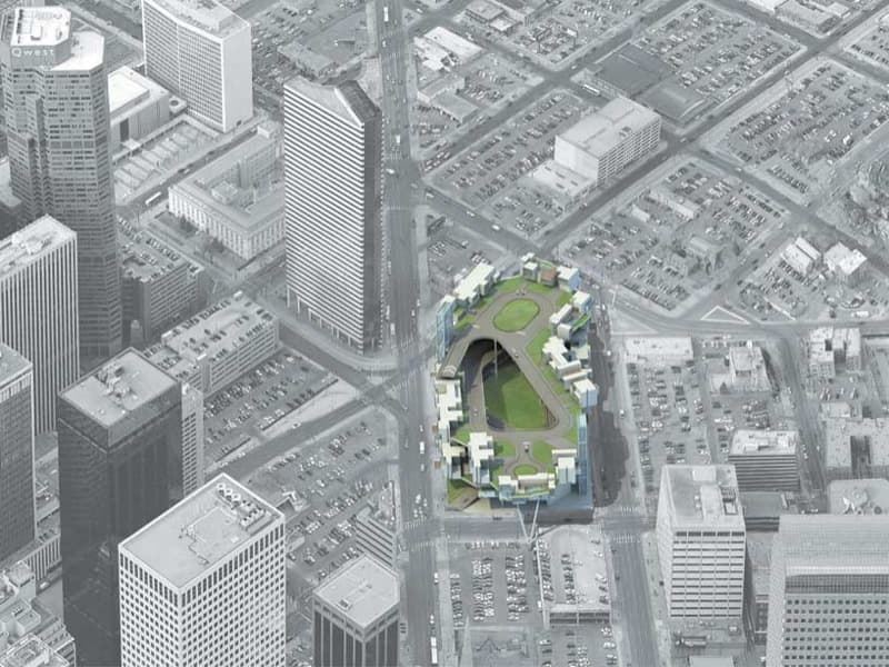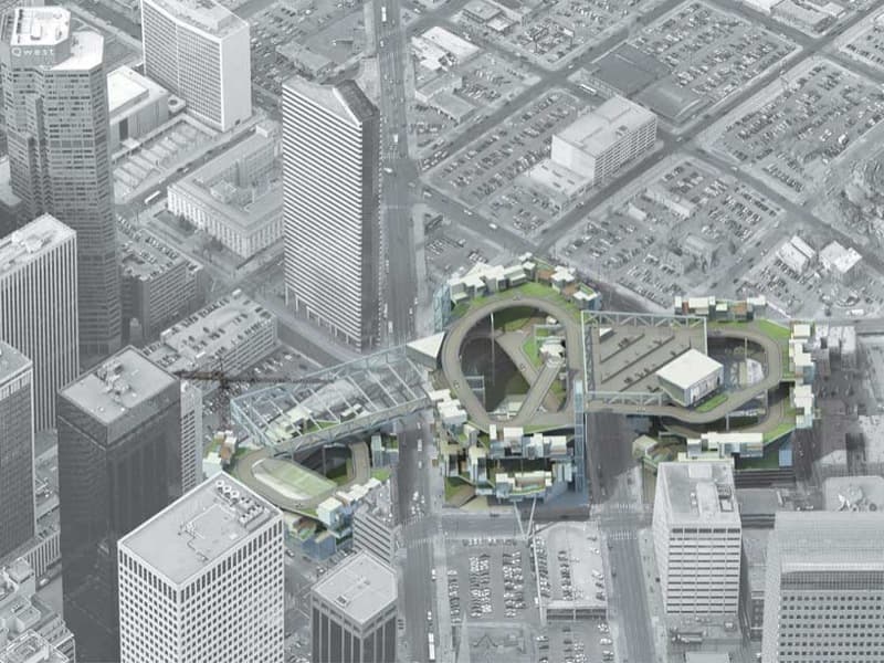 Esta recreación urbana tan poco común está realizada sobre el tejido de la ciudad americana de Denver (Colorado). Es un experimento de expansión urbanística que busca el crecimiento creando nuevas capas de ciudad. Lo hace en el mismo espacio, y como si de un parásito se tratara. Estos modelos urbanos además se producen sin recurrir a grandes edificios, creando unos entornos híbridos, aumentando la densidad. Es un modelo en el que lo urbano y suburbano se funden.