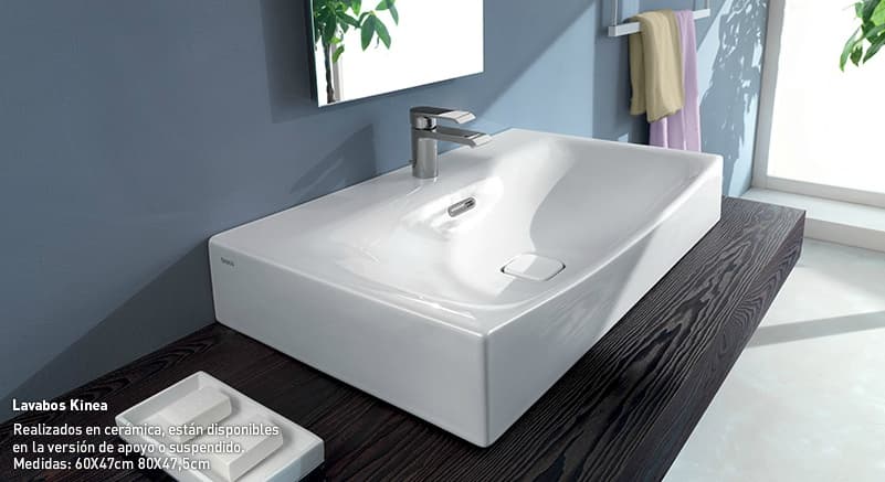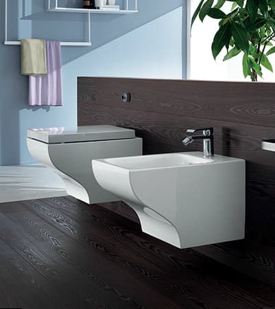 El lavabo es bastante sencillo, aunque con un tipo de desagüe muy particular. Puede ir suspendido o apoyado sobre una encimera; está fabricado en cerámica en dos tamaños diferentes (60x47cm, 80×47.5cm). El inodoro y bidé están disponibles en versión suspendida, manteniendo el mismo tipo de desagüe, pero con el frontal formando una gran moldura.