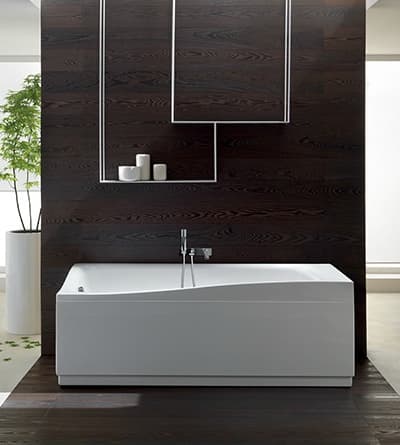 La bañera también incorpora esa curva característica en KINEA, pero en una de sus esquinas. Está disponible en tres tamaños: 170x70cm, 170x75cm, y 180x80cm. Se puede pedir con o sin hidromasaje, ya sea hidro basic, hydrosilence, o hydrosonic. La bañera puede llevar una mampara de cristal diseñada también por Teuco, convirtiéndola en una práctica ducha.