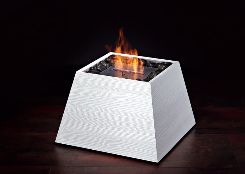 La chimenea Maya se puede adquirir en dos tamaños diferentes: con la base de 70cm y altura de 47cm; o con 56cm y 37cm respectivamente. Su acertado diseño en forma de tronco de pirámide está disponible en varios acabados, desde el panel de madera de iroko (MDF), dorado, plateado, negro, blanco, y madera de roble. El quemador es de acero inoxidable en todos los modelos.