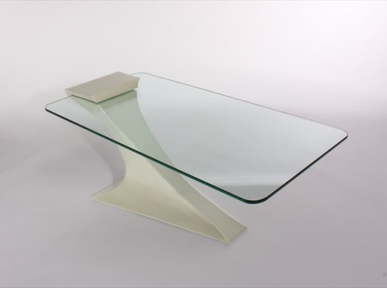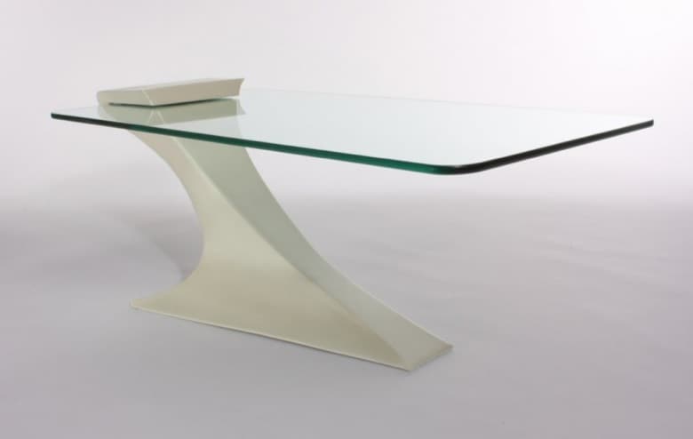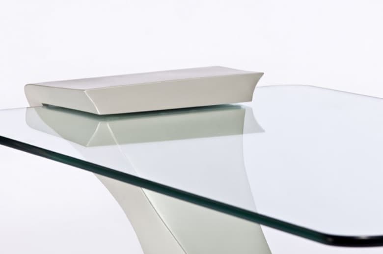 Dos son los elementos que la componen. Por un lado está el apoyo, realizado con chapa de acero de 3mm de espesor, pintado en color blanco roto. Por otro tenemos el tablero de vidrio templado, que tiene 13mm de grosor. Ese espesor parece ser suficiente para soportar el peso de lo que se suele colocar en una mesa. Lo más interesante de este mueble fue el diseño de su base. Es un elemento atractivo que ayuda a dar estabilidad a todo el conjunto. Hay dos versiones de su tablero, en forma rectangular o circular.