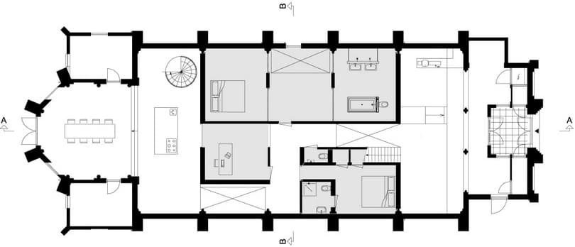 Analizando los planos del proyecto, podemos darnos cuenta que lo nuevo se corresponde con los espacios privados (dos dormitorios). Además hay una habitación de estudio u oficina. Ambos dormitorios tienen baño propio, siendo el principal bastante grande, pero además se ha añadido un pequeño aseo para uso general (lógico). El resto del espacio queda libre, colocándose al fondo de la nave la cocina y el comedor. Como era de esperar, la ‘azotea’ de la estructura nueva se ha utilizado para un gran salón, al que se accede por dos escaleras. Esta zona de la casa está conectada mediante una pasarela con lo que era el coro de la iglesia. Todo esto se ve estupendamente en el plano de sección.