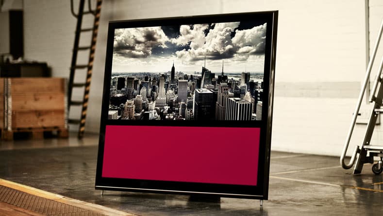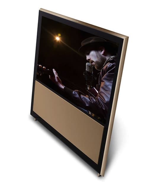 Hay que recordar que este modelo no es más que una edición limitada de 46 pulgadas, en acabado dorado, de la colección BeoVision 10. En ella hay modelos de 32″ y 40″, con marco plateado o negro, y con siete colores diferentes de tela. Su diseño se basa en un cristal negro enmarcado en un perfil de aluminio, que tiene en la parte trasera un soporte de pared. Este elemento permite girar la pantalla en un ángulo de 45º. El aparato puede colocarse también apoyado sobre el suelo. El televisor se convierte por tanto en un objeto decorativo más, incluso cuando no está en funcionamiento.