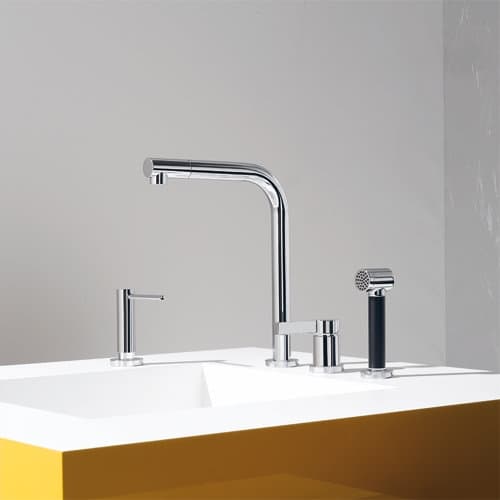 ELIO es un grifo pensado para facilitarnos la vida en muchas de las tareas de una cocina. Con él es fácil hacer el lavado de verduras, vajillas, ollas grandes… Su mango flexible es muy práctico, alcanzando con comodidad todas las zonas del fregadero. Hay que tener en cuenta que se trata de un grifo de cocina que abarca un gran abanico de posibilidades, por la posición del mando, y por el tipo de ducha que se escoja. Está disponible con acabados en cromo pulido, y en platino mate.