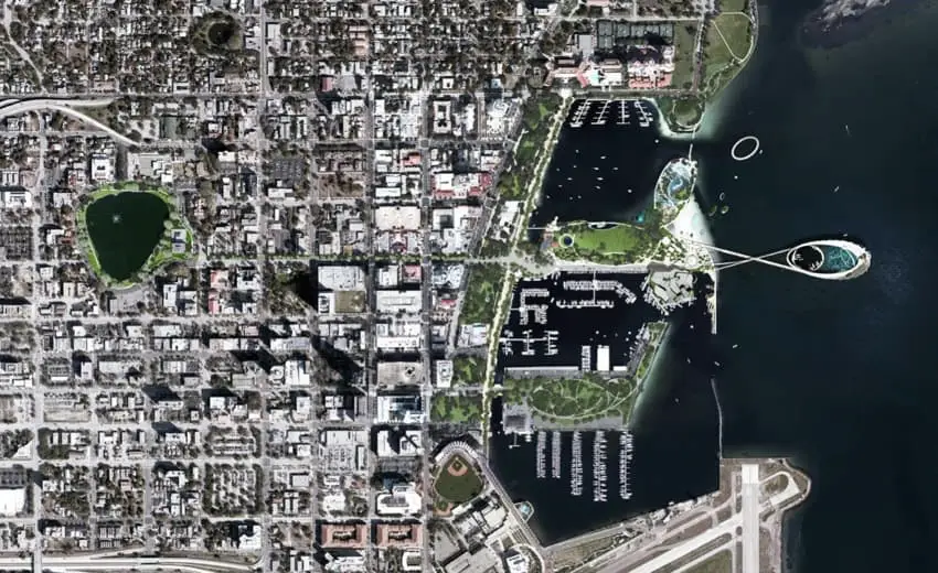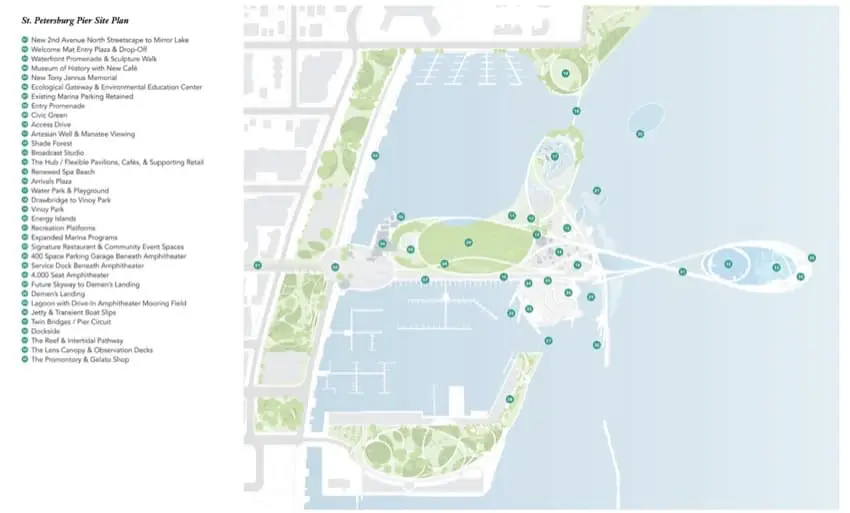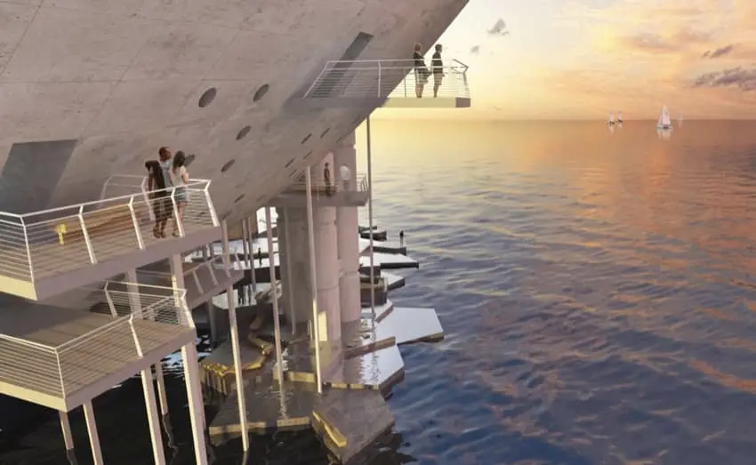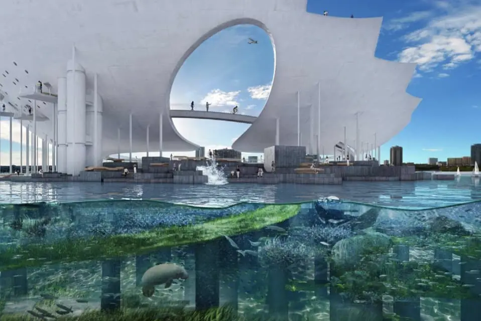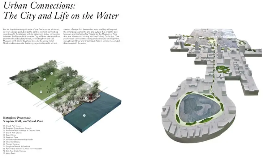 Para sustituir el actual muelle, el equipo de Michael Maltzan y sus colaboradores han optado por una extensa estructura, similar a una lupa sobre el agua. Está formada por una membrana alabeada de hormigón, con un perfil dentado que recuerda a las velas de los barcos, y que está recorrida por dos caminos peatonales, a distintos niveles. Evidentemente, sería un nuevo icono para San Petersburgo, que ayudaría a fortalecer la relación que tiene con el agua, y que serviría de zona vital y activa para sus habitantes. También rompería con el tradicional camino unidireccional del típico muelle. Hay que entender esta parte de la actuación como un circuito que se puede recorrer de muy diversas maneras, aportando una gran variedad de experiencias a sus visitantes que vienen a pie, en bici, o en bote.