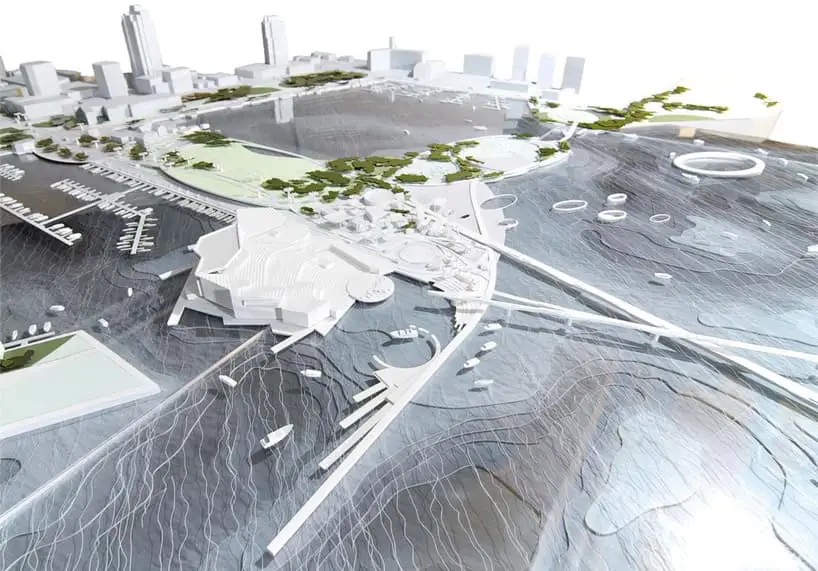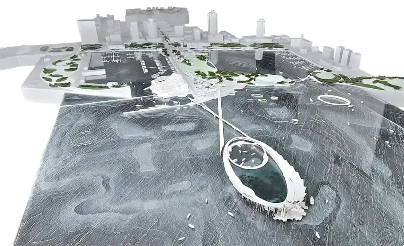 Hacia la costa, los lazos de la Lente se extienden para conectar las explanadas verdes del paseo marítimo con el puerto, con una amplia gama de experiencias recreativas, tanto en tierra firme como en el agua: nuevo puerto deportivo, playas, lagunas. La propuesta añade un gran anfiteatro con espacios anexos abiertos, conectando la playa con una nueva zona de cafés y quioscos. Tendríamos que redactar tres artículos para poder describir cada uno de los espacios que este proyecto incluye, porque se ha diseñado hasta un parque acuático.