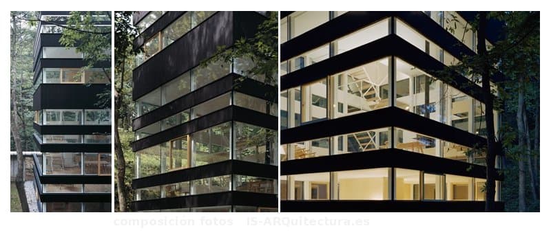La vivienda se edificó con la altura máxima permitida, alcanzando tres plantas (más un semisótano) pero con el mismo tratamiento en todas sus fachadas, con bandas alternadas de vidrio y madera. No están publicados los planos del proyecto, aunque tampoco hacen mucha falta ya que los niveles están bastante diáfanos. Es importante observar que, a pesar de tener mucho vidrio, las franjas opacas de esta casa están estratégicamente situadas. La intención era aportar más privacidad de la que inicialmente aparenta.