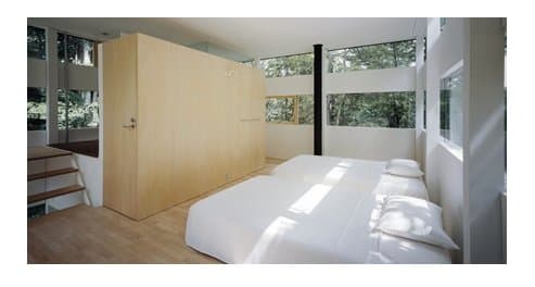 La escalera está situada en un rincón, siendo bastante visible en el salón (con cocina), debido a la altura libre que presenta. El dormitorio está en la última planta, donde un mueble-armario se emplea como pared divisoria con el cuarto de baño, el cual está un poco elevado con respecto a la habitación. Uno de los aspectos que más nos ha llamado la atención de la Ring House es la poca presencia del mobiliario, pues ha sido integrado con mucho acierto, permitiendo que desde dentro se siga percibiendo el edificio como una torre acristalada.