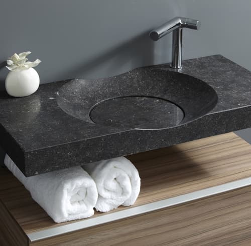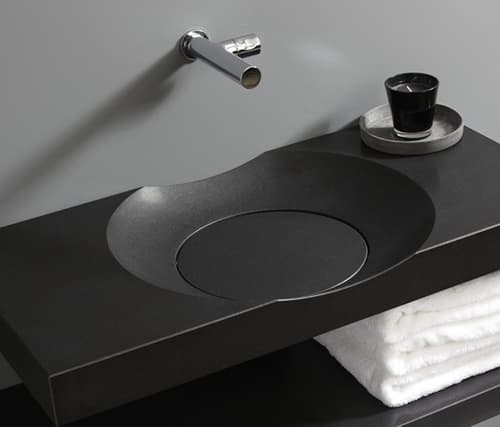 En estos lavabos de Giquadro el drenaje se resuelve por el perímetro de  una pieza circular situada en su fondo, está ahí, pero no se ve el típico agujero de salida. Viene en ocho tamaños diferentes, ya sea sencillo o doble, y están fabricados en piedra tallada de granito negro, cuarzo composite blanco, o piedra azul belga.