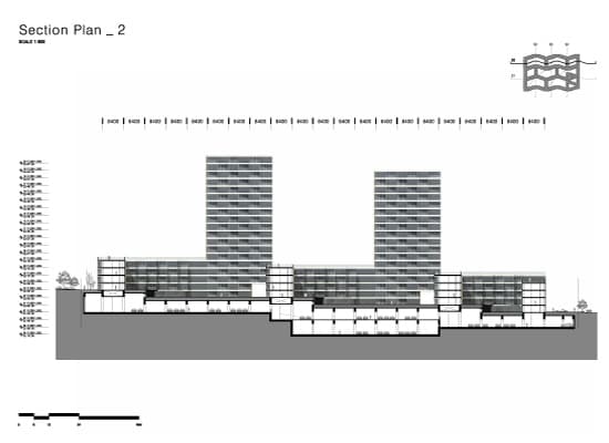 La ordenación se ha realizado combinando tres tipologías: bloques de viviendas en manzana cerrada con patio interior, la de vivienda en hilera, y por último la del bloque de pisos en altura. El resultado final es el de un imponente edificio en el que se repite la misma fachada, pero que está proyectado también para ‘hacer ciudad’, a la vez que se adapta a la topografía del terreno (ver planos de sección).