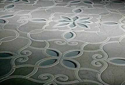 Aunque pueda parecer que se trata de una superficie antigua, estas imágenes corresponden a un producto actual, son unas baldosas artísticas compuestas por incrustaciones de piedra y vidrio translúcido, en su versión de color humo, azul cielo, y blanco de Carrara, aunque también se pueden conseguir en combinaciones y colores a medida, con el fin de que encajen en el espacio específico de cada cliente.