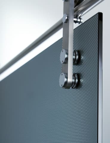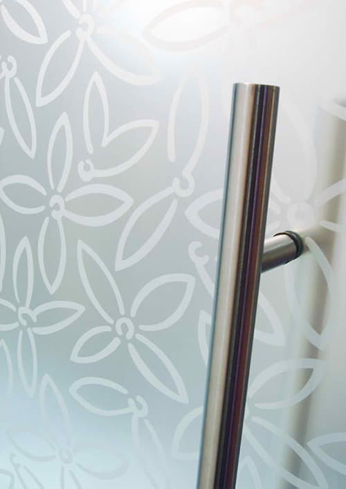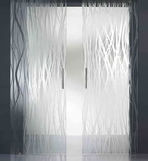 Estas puertas correderas están formadas por paneles de vidrio decorado, cuyo efecto no se ha conseguido con la técnica tradicional de ‘chorro de arena’, sino que la superficie del vidrio ha sido tratada con un agente químico (ácido), adquiriendo un acabado satinado, suave al tacto y resistente a huellas.