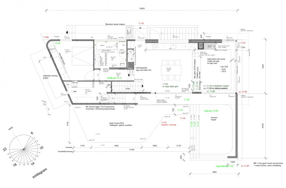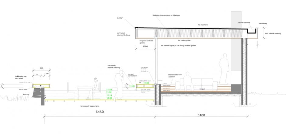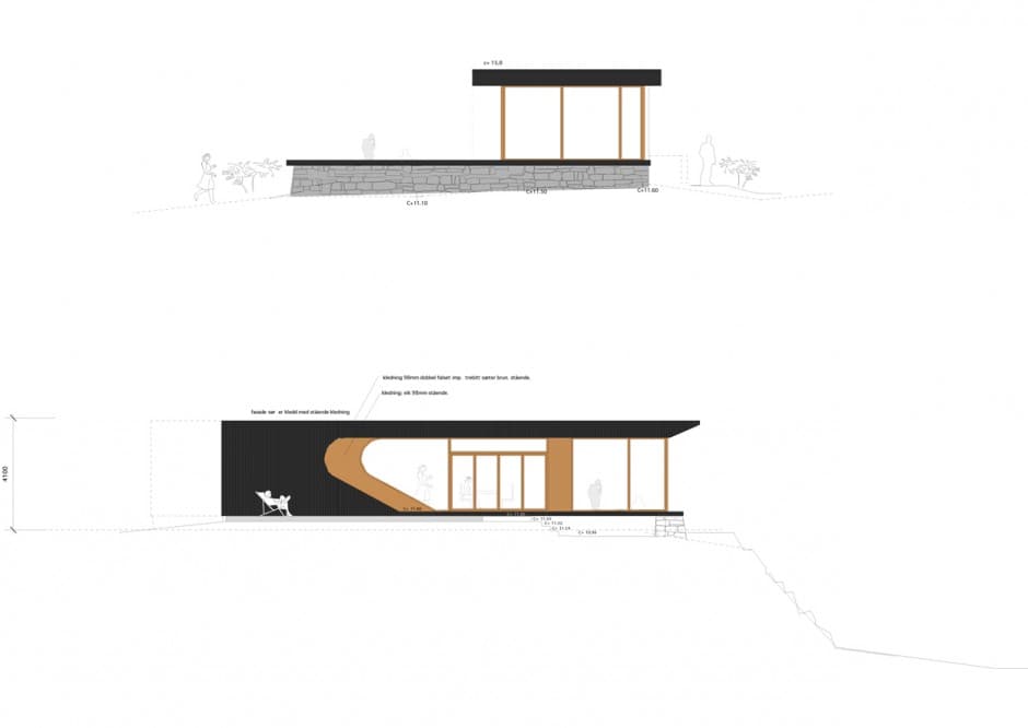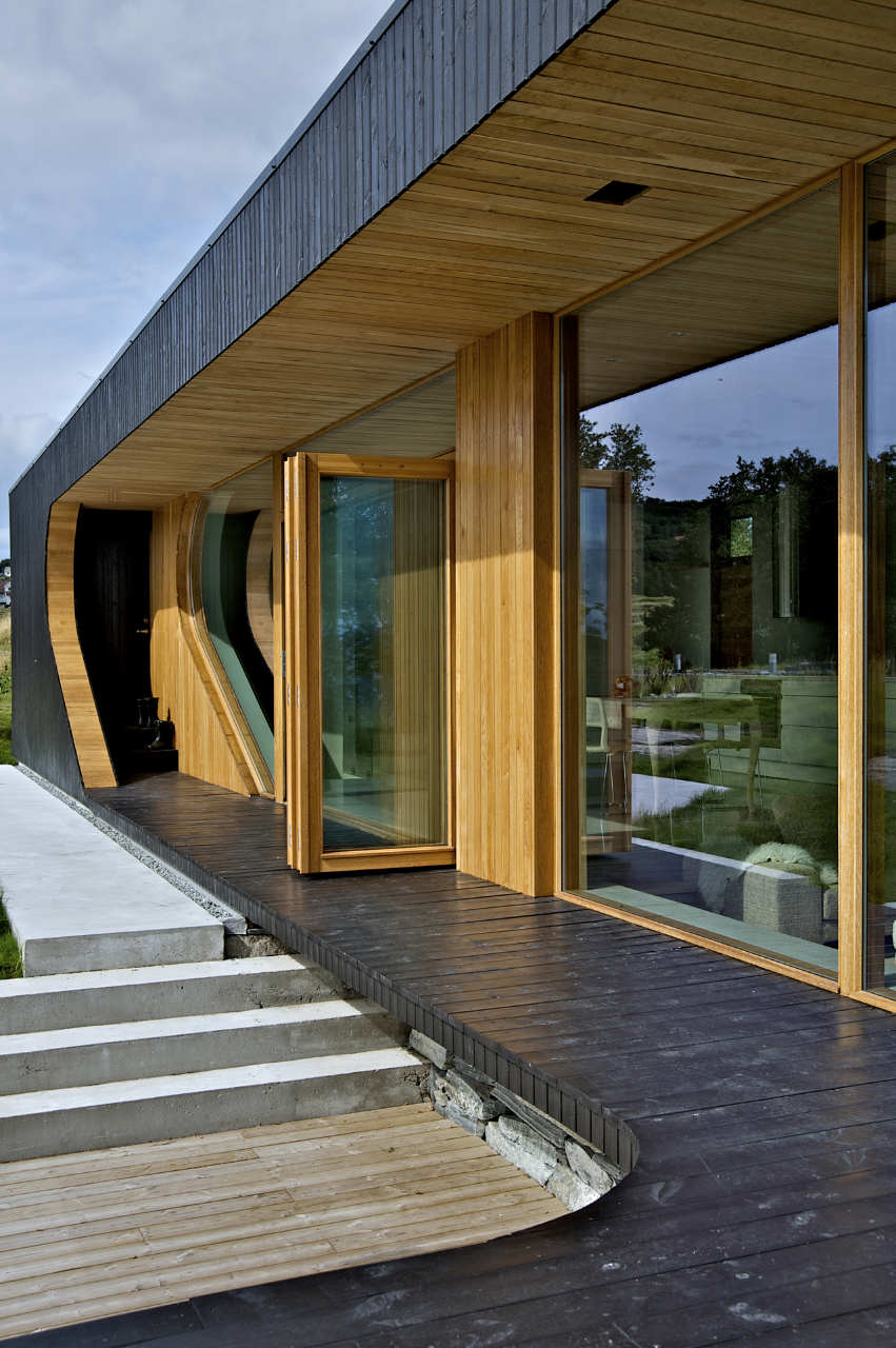 El edificio emplea diferentes materiales como la madera, el vidrio y el hormigón, mas algunos muros de piedra para componer el espacio exterior. En la fachada se han utilizado dos tonos diferentes en el revestimiento de madera, que unido a ciertos elementos curvos, le da a la casa un carácter muy singular. Este detalla es bastante típico del arquitecto autor del proyecto (Tommie Wilhelmsen).