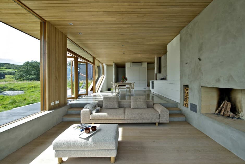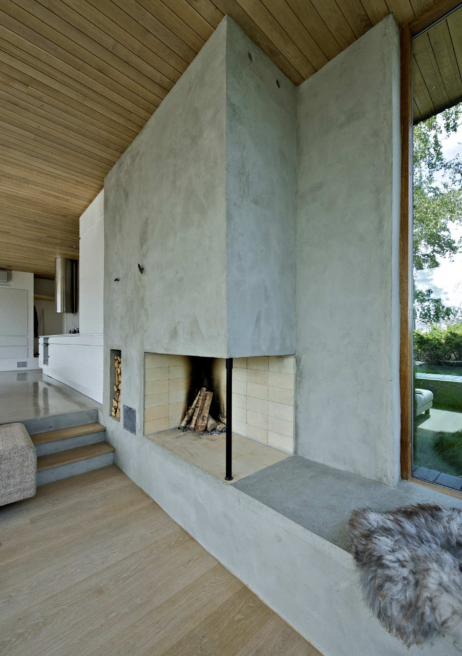 Es muy interesante cómo el mismo tratamiento de madera de los techos se prologa hacia los vuelos de la cubierta. En el interior se ha utilizado un acabado de hormigón pulido para el suelo del nivel intermedio, el resto es de madera. En cambio no ha quedado muy bien el estucado gris de algunas paredes, porque rompe la armonía. Este detalle se puede apreciar con claridad en la zona de la chimenea. Eso sí, las puertas plegables que dan al comedor son fabulosas.