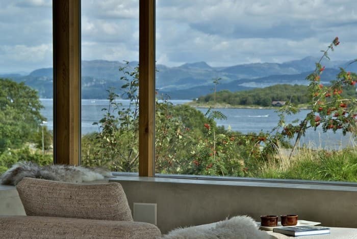 La vivienda se ha organizado en diferentes niveles. Se accede desde el intermedio, donde están la cocina y el comedor. El salón queda en la zona más inferior, pero con todos los frentes acristalados para disfrutar de las hermosas vistas. El cuarto de baño y el dormitorio están dos peldaños más arriba. Desde el exterior (fachada principal) hay una pequeña escalera que conduce a un cuarto de instalaciones. En el lado opuesto hay otra escalera que lleva al sótano. Desde el interior de la casa también se puede bajar al nivel subterráneo.