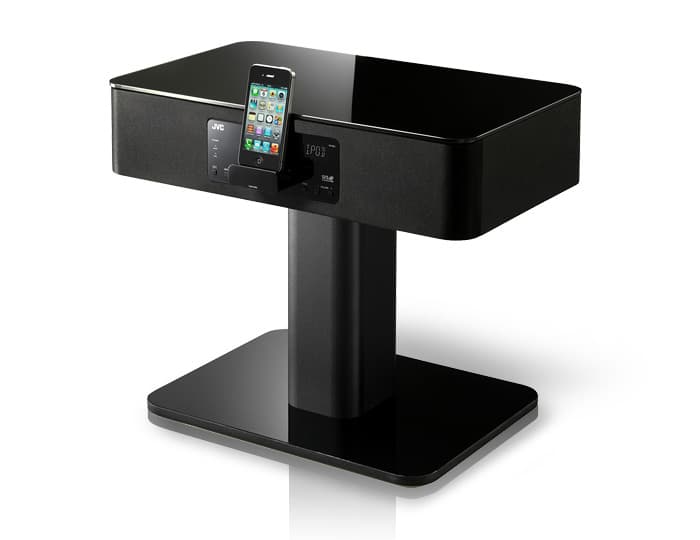 El JVC NX-BX3 es un mueble con un sistema de audio que incorpora unos altavoces (muy bien camuflados), y que puede utilizarse tanto como mesita de noche en el dormitorio, o como mesa auxiliar en cualquier otra parte de la casa. Una bandeja retráctil en su parte frontal contiene una base dock compatible para el iPhone/iPod Touch, y está rematado con un vidrio templado en la parte superior. Como era de suponer, existe una versión en blanco y otra en negro. Tiene una altura total de 40cm, una anchura de 50cm, y 30cm de profundidad.