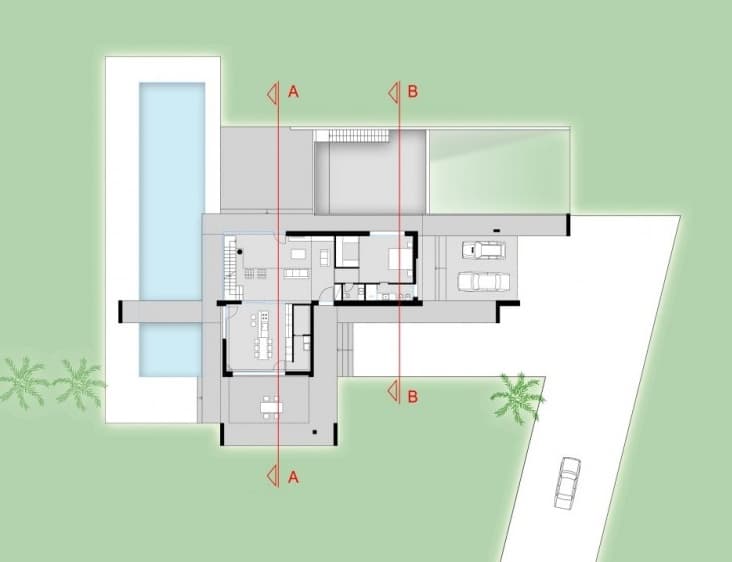 La Villa T tiene la apariencia de ser de una sola planta, aunque la inclinación de una de sus cubiertas permite una doble altura por uno de sus frentes. Precisamente paralela a esta fachada se ha realizado una amplia rampa que baja hasta una planta subterránea, obteniéndose por tanto una casa de tres niveles, con dos de los dormitorios en el sótano (uno de ellos poco ventilado), y otros dos en las plantas más ‘nobles’.